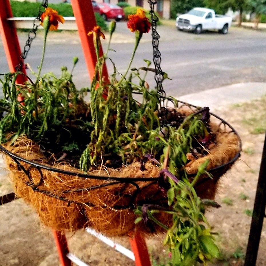 This weekend saw me back at the house, after having to give up my last weekend due to hay hauling. Of the many things that I was asked to do, one of the most simplest tasks was to water the front flower beds. Sounds pretty simple right? Just like all things however, more was required than just spraying the flowers that were planted in the ground. We also have two hanging baskets, and two pots with herbs growing in them sitting on the front porch. Turns out when I was watering, I forgot the hanging baskets as well as the pots. Oops! Hopefully we’ll be able to save the plants.