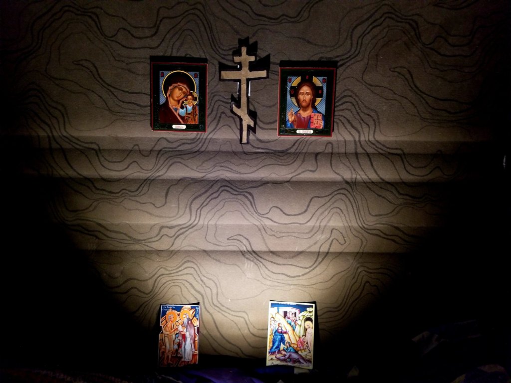 Next to one of the loading docks I found a large piece of cardboard and after peeling a a few of the dirtier layers off I finally found something a little more usable, I took it back into the truck and with a sharpie and a knife, I cut out my own three bar Orthodox cross. Then I placed an icon of Christ to the right of the cross, and an icon of the Theotokos on the left. I then closed all of the curtains in my truck and grabbed my phone. On it I had an audiobook version of the psalter and I figured if I turn my flashlight on and had the audio psalter playing, I could have the right ambiance for an at-home personal service. I couldn’t actually live stream any of the Pascha services, because I was in Canada. You see, Verizon Wireless has a nice little caveat when it comes to their unlimited plans. You’ll get unlimited data when you’re in Canada but only 500 megabytes per day will be high speed. I have to use my international data very carefully because I rely on it for my job and I knew that if I participated in any live streams my daily allowance would be up quickly.